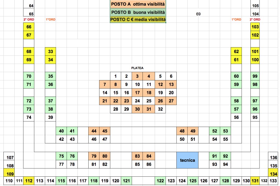 Pianta del Teatro Caporali con i posti disponibili in base alle norme vigenti sul distanziamento sociale: